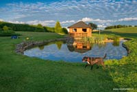 wypoczynek nad zarybionym prywatnym stawem z fontanną o powierzchni ok. 120m2