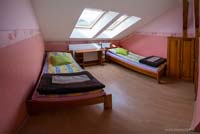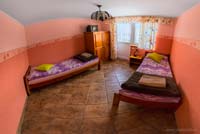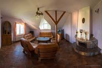 - Piętro: 6 jasnych i przytulnych pokoi (2-osobowych), każdy z własną łazienką i WC. Także na piętrze do dyspozycji gości komfortowy pokój wypoczynkowy z TV i kominkiem.